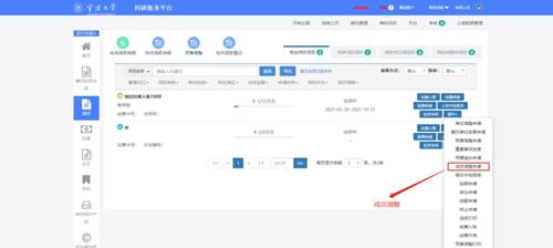 4. 进入项目组成员,请确认成员是否完整。特别是项目中有学生的参与的,请完善学生身份类别。成员信息有问题的,进入科研系统新濠娱乐城,左侧的项目界面,点击操作下拉框下的成员调整申请,进入成员调整界面进行添加和修改,待项目主管审核之后,会自动补充到项目经费公开一览表,最后再提交即可。